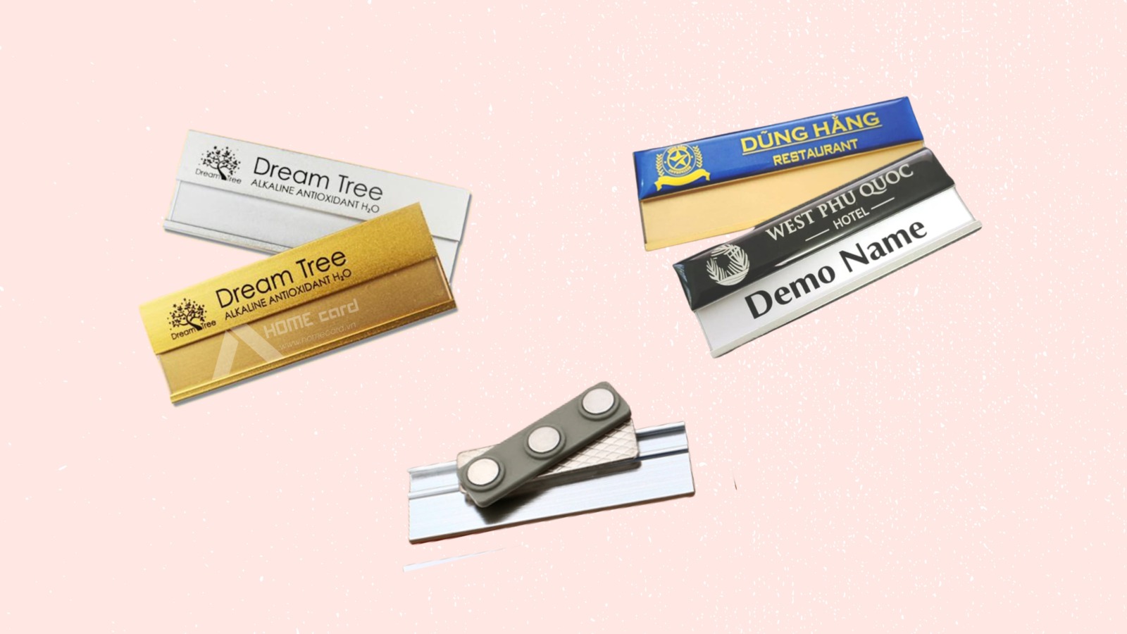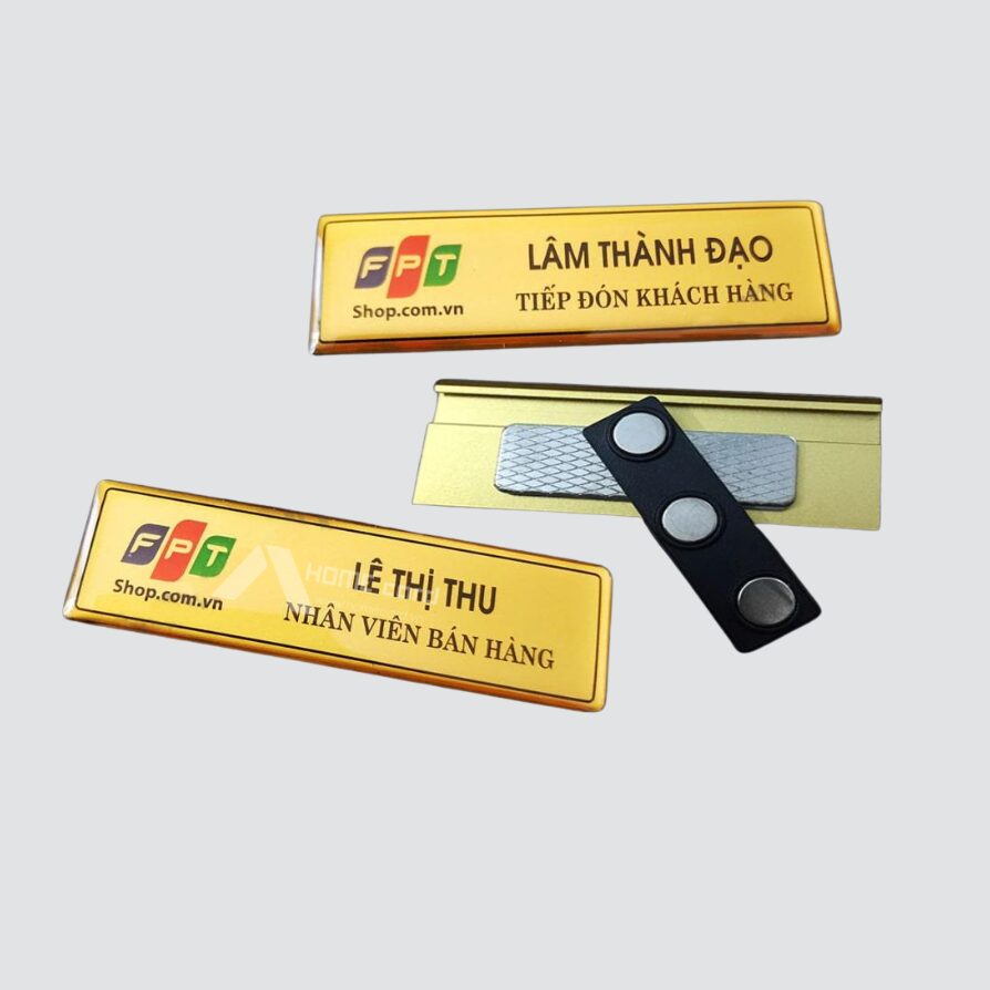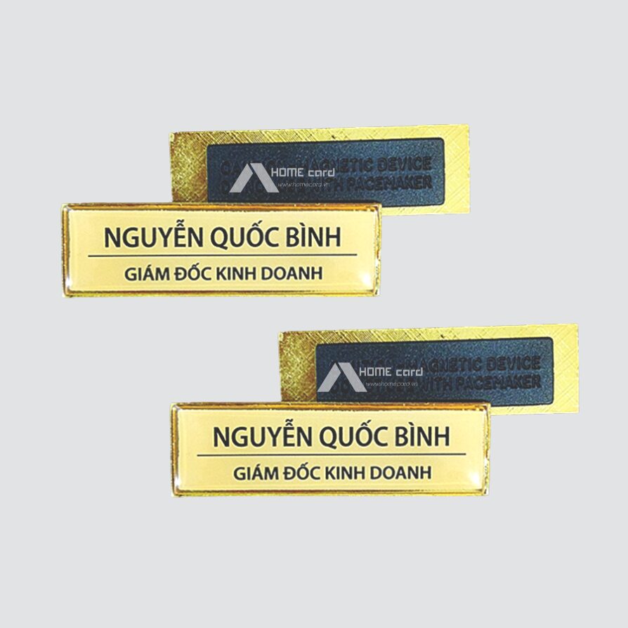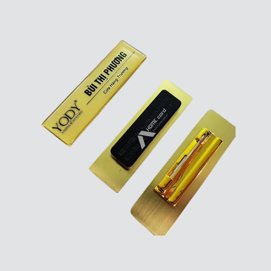 Thẻ bảng tên cài áo là loại thẻ nhỏ gọn, được thiết kế để gắn trực tiếp lên áo bằng ghim hoặc nam châm, giúp nhận diện nhân viên nhanh chóng và chuyên nghiệp. Thẻ thường được làm từ nhựa PVC hoặc mica, in rõ ràng tên, chức vụ và logo công ty. Đây là lựa chọn phổ biến trong các doanh nghiệp, nhà hàng, khách sạn nhằm tạo ấn tượng lịch sự và đồng nhất trong môi trường làm việc.